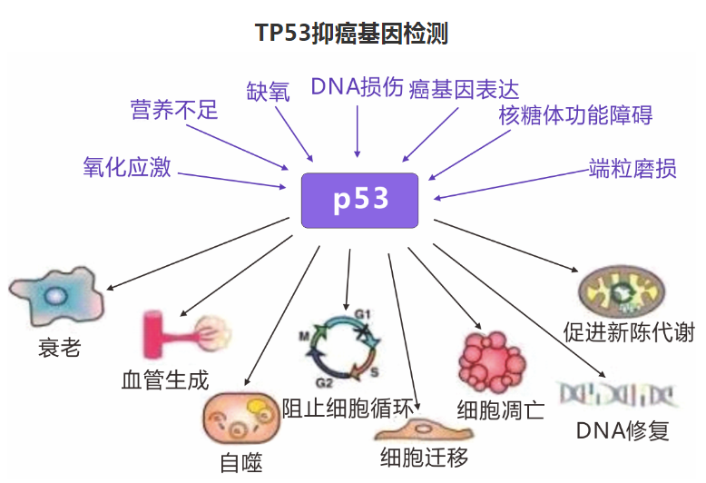 TP53基因是人体重要的抑癌基因,定位于人类第17号染色体的短臂上,编码和表达P53蛋白,是迄今发现与肿瘤相关性最高的基因。TP53基因是细胞生长周期中的调节因子,不仅可以阻止肿瘤细胞分裂、诱导肿瘤细胞凋亡,还可以修复正常DNA的损伤。野生型P53蛋白可抑制带有DNA损伤和染色体畸变的细胞发生分裂,从而阻止畸变传递给子细胞,具有广谱的肿瘤抑制作用。TP53基因的突变与肿瘤的发生发展密切相关,因而被称作人体的“基因警察”。TP53变异与近一半以上的癌症发生有关,据统计数据显示,75%的癌症患者都存在TP53基因突变。包括肺癌、胃癌、肝癌、膀胱癌、食管癌、乳腺癌、宫颈癌等多种癌症。